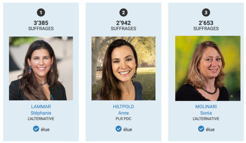 Les Carougeois ont porté trois femmes au Conseil administratif, une première genevoise. Et sans hésitation aucune: les deux sortantes Stéphanie Lammar (PS) et Anne Hiltpold (PLR), accompagnée de la Verte Sonja Molinari, ont été élues dès le premier tour, à la majorité absolue. Un triomphe!