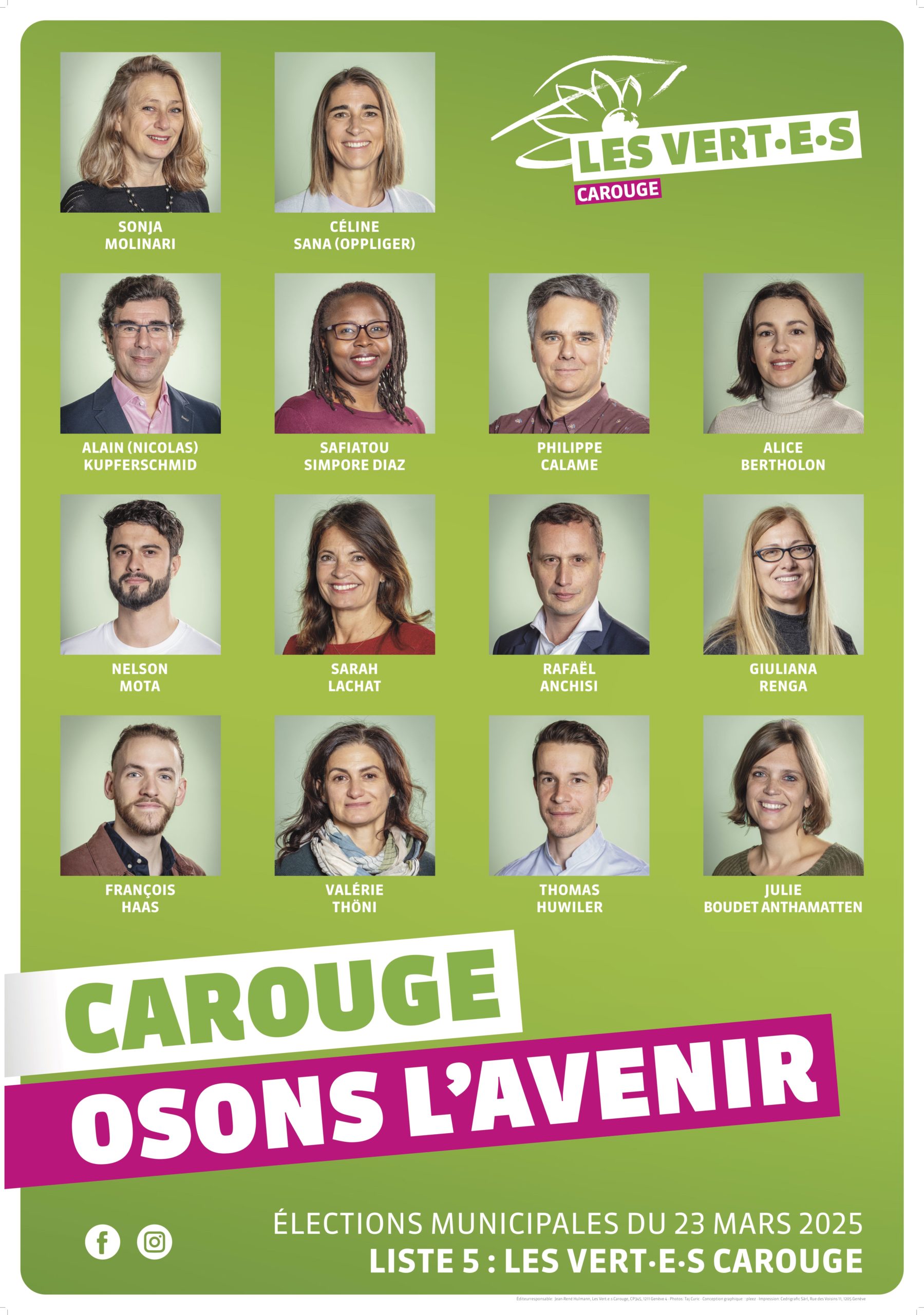 Retrouvez sur cette page nos candidat·e·s au Conseil municipal. Sonja Molinari, candidate au Conseil administratif et sortante, est à la tête de la liste n°5 des Vert·e·s de Carouge.